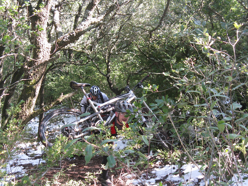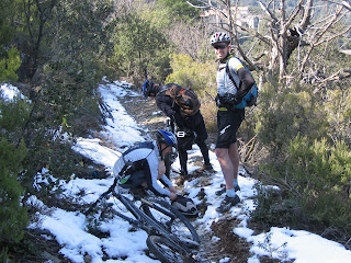 Quelques centaines de mètres plus bas on entame une descente ‘majeure’ comme diraient certains, et pour cause elle figurait au programme de l'endur'haut Languedoc. Une descente à faire pâlir les gorets (pour ceux qui connaissent) hyper technique où les mollets et les tibias souffrent. On s'est bien fait brasser, quelques chutes et OTB sans conséquence