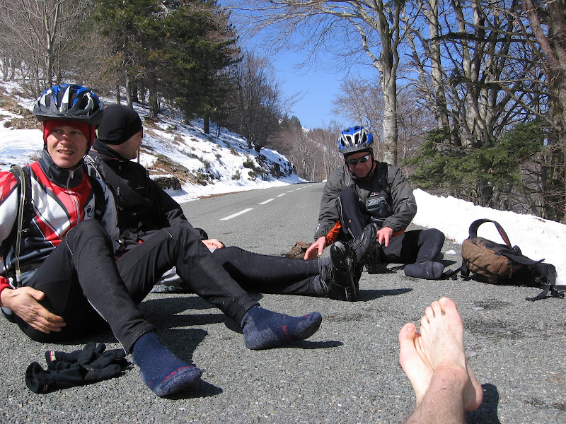 Mais quelques plaques de neige commencent à faire leur apparition. Ça ne nous empêche pas de faire une première pause pépère sous le soleil du sud.