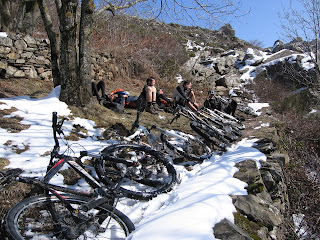 On coupe par la route, et on embraye sur un chemin qui fleure bon la redescente. Quelques centaines de mètres plus loin, on se pose sur un coin à l’abri du vent, en plein soleil. Petite sieste