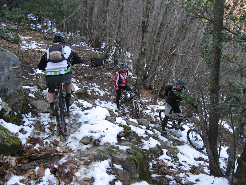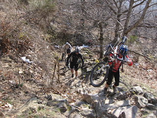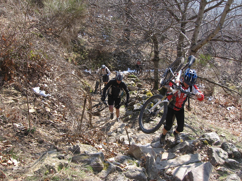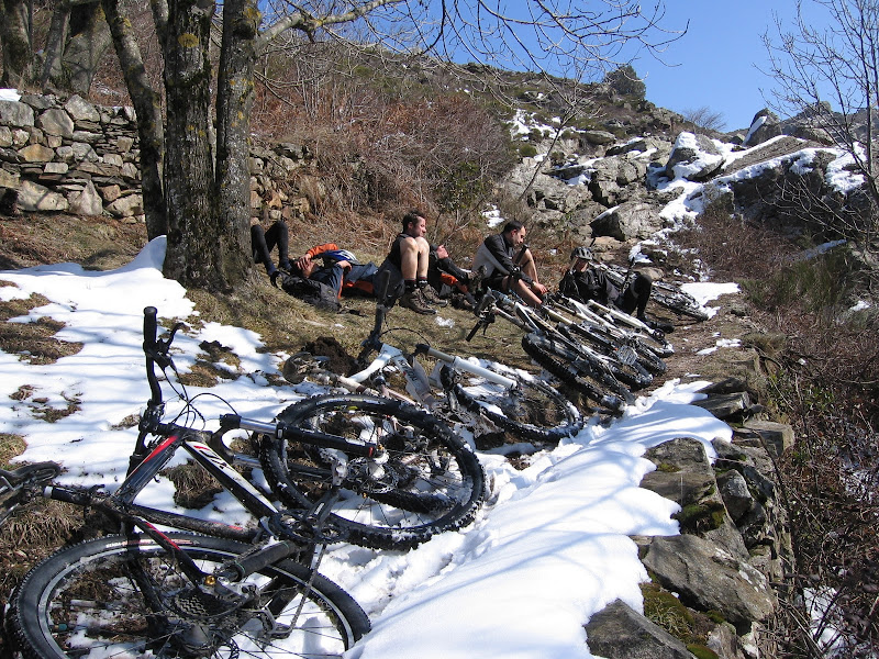 Quelques centaines de mètres plus bas on entame une descente ‘majeure’ comme diraient certains, et pour cause elle figurait au programme de l'endur'haut Languedoc. Une descente à faire pâlir les gorets (pour ceux qui connaissent) hyper technique où les mollets et les tibias souffrent. On s'est bien fait brasser, quelques chutes et OTB sans conséquence